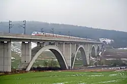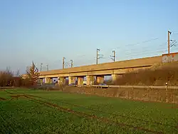 In the vicinity of the Fulda Viaduct in Kragenhof (km 133), the high-speed line begins to run generally parallel with the north-south line, which it will follow for nine kilometres to the southern outskirts of Kassel.[10] The line passes the western edge of the Kassel marshalling yard and reaches Kassel-Wilhelmshöhe station at route kilometre 144. The station, which was newly built as part of the high-speed line, bypasses the Kassel Hauptbahnhof terminus. In the Kassel area, the line runs for around 15 kilometres next to existing lines.[11]