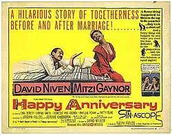 Happy Anniversary is a 1959 American comedy film starring David Niven and Mitzi Gaynor. Directed by David Miller, the movie's cast also included Carl Reiner and a young Patty Duke.