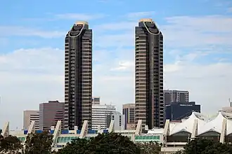 Harbor Club Condominiums is a high-rise residential building in San Diego, California, United States, composed of two towers of equal height. The 41-story towers have a height of 424 feet (129 m) and are a prominent fixture in the city's skyline. Located in the Marina district of downtown San Diego, Harbor Club was designed by architects BPA Architecture Planning Interiors. The condos are located near the San Diego Convention Center and Petco Park. The towers are currently the tenth-tallest buildings in San Diego.