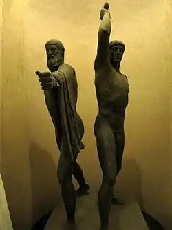A sculptural pairing of the tyrannicides Harmodius and Aristogeiton (Ancient Greek: Ἁρμόδιος καὶ Ἀριστογείτων, romanized: Harmodios, Aristogeitōn) was well known in the ancient world in two major versions but survives only in Roman marble copies. The lovers Harmodius and Aristogeiton were Athenian heroes whose assassination of the tyrant Hipparchus in 514 BC opened the way for Athenian democracy.