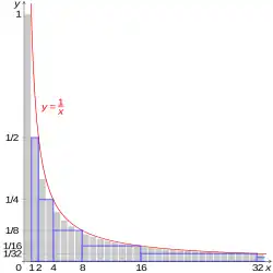 It is possible to prove that the harmonic series diverges by comparing its sum with an improper integral. Specifically, consider the arrangement of rectangles shown in the figure to the right. Each rectangle is 1 unit wide and units high, so if the harmonic series converged then the total area of the rectangles would be the sum of the harmonic series. The curve stays entirely below the upper boundary of the rectangles, so the area under the curve (in the range of from one to infinity that is covered by rectangles) would be less than the area of the union of the rectangles. However, the area under the curve is given by a divergent improper integral, Because this integral does not converge, the sum cannot converge either.[13]