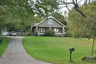 The Hartwell House is a historic house in Reading, Massachusetts. The 1+1⁄2-story wood-frame house was built in 1918 for George Hartwell, an engineer. The most prominent feature of this Craftsman/Bungalow style house is its stonework: the front porch is supported by tapering piers of fieldstone, and the full length of its chimney is similarly composed. There is a decorative woodwork trellis at the peak of the front gable.[2]