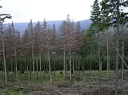 Recently, the Harz National Park has suffered from bark beetle outbreaks as well as acid rain and other environmental problems. The bark beetle is on the rise here due to climate change and global warming. Since 2006, there has been increased bark beetle gradation. Hurricane Kyrill also caused severe damage in the region. Stands of trees, especially spruce, were torn down over wide areas. The National Park management came under fire from the local communities as a result of the bark beetle measures that were subsequently needed. In particular, the National Park community at Ilsenburg criticized the use of technology (e.g. harvesters). Because of the inaccessibility of the terrain there was really no other way to haul the wind blown tree trunks from the affected areas.[11]