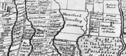 Haverford Township was founded by Welsh Quakers in 1681 on land purchased from William Penn. The settlers named their new home after Haverfordwest (Hwlffordd) in Wales. The township is home to many historic sites. The Grange Estate entertained the Revolutionary War figures George Washington and General Lafayette. Nitre Hall, along Karakung (Cobb's) Creek, supplied the United States with over 800,000 pounds of gunpowder during the War of 1812. Leedom Hall[3] was the probable home of William Howell, the founder of Haverford Mills, which date from 1688.[4] Other Havertown sites listed on the National Register of Historic Places include the Federal School and Lawrence Cabin. Coopertown appears as early as 1848 as the first community, and the earliest post office is found at the Spread Eagle Tavern at the junction of the present Eagle and Manoa Roads.[5] The Haverford Township Historical Society maintains a survey of historic resources notable to the township.