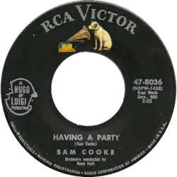 "Having a Party" is a song by American singer-songwriter Sam Cooke, released on May 8, 1962, by RCA Victor. Produced by Hugo & Luigi and arranged and conducted by René Hall, the song was the A-side to "Bring It On Home to Me". The song peaked at number four on the US Billboard Hot R&B Sides chart, and also charted at number 17 on the Billboard Hot 100.