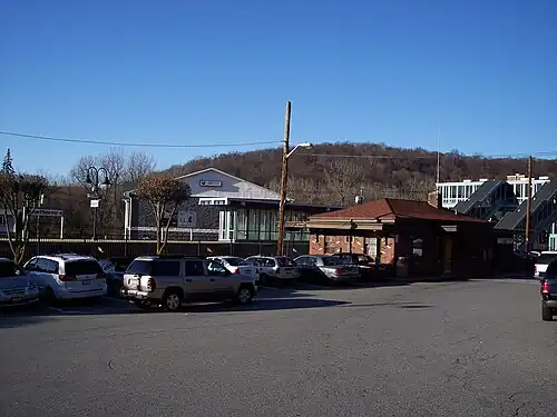 Rail service in Hawthorne can be traced as far back as 1847, when the New York and Harlem Railroad built a line and a railroad station with the name "Unionville", the former name of Hawthorne itself. The railroad and the station became part of the New York Central and Hudson River Railroad in 1864 and was eventually taken over by the New York Central Railroad. By the early 20th century, when Rose Hawthorne Lathrop established a home for victims of incurable cancer, the community and the station were renamed "Hawthorne". A grade crossing existed just north of the station for Broadway at Elwood Avenue until 1951, when the New York State Department of Public Works realigned New York State Route 141 onto a bridge over the tracks south of the station leading to a wye at Elwood Road.[2][3] Sometime during the late-1950s the former Richardson Romanesque depot was replaced with a simple brick structure.