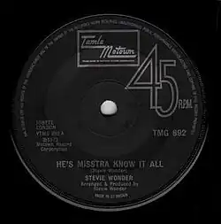 "He's Misstra Know-It-All" is a single by Stevie Wonder for the Tamla (Motown) label, from his Innervisions album, which reached number 10 on the UK Singles Chart in April 1974.[2] The song takes the form of a mellow ballad with a steady beat, principally a solo performance with Wonder providing lead vocal, background vocal, piano, drums, handclaps and congas.[3] Horn sounds are played on the Moog synthesizer that is programmed by Malcolm Cecil and Robert Margouleff.[4] Ethereal flute-like sounds are provided by the TONTO modular synthesizer that is also programmed by Cecil and Margouleff. Willie Weeks, on electric bass, is the only other musician.[3] Towards the end of the song the mood changes to a stronger feel, more strident singing and with hand-claps emphasising the beat, half-beat and quarter-beat.