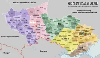 Hegewald was a short-lived German colony during World War II, situated near Zhytomyr in Reichskommissariat Ukraine. It was repopulated in late 1942 and early 1943 by Volksdeutsche settlers transferred from occupied territories of Poland, Croatia, Bessarabia, and the Soviet Union to an area earmarked for the projected Germanization of the Ukrainian lands. Plans were prepared months in advance by the SS, RKFDV and VoMi, but major problems with supplies occurred right from the region's initial establishment.[1] Heinrich Himmler's original plans to recruit settlers from Scandinavia and the Netherlands were unsuccessful.[2]