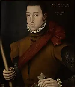 Also in January 1555, Dudley's mother died, leaving Henry some money, which Queen Mary allowed him to inherit despite his attainder.[1] However, the Dudley brothers were only welcome at court as long as King Philip was there;[27] later in 1555 they were even ordered out of London and the next year, in the wake of a conspiracy by their distant cousin Henry Sutton Dudley, the French ambassador Antoine de Noailles reported that the government was seeking to apprehend "the children of the Duke of Northumberland", who were said to be on the run.[28][29] By January 1557, the brothers were raising personal contingents to fight for Philip II, now also King of Spain. Henry with his brothers joined the Spanish forces in France and took part in the Battle of St. Quentin, where Henry Dudley was killed.[1]