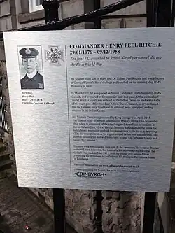 Henry Peel Ritchie VC (29 January 1876 – 9 December 1958) was a recipient of the Victoria Cross, the highest and most prestigious award for valour "in the face of the enemy" that can be given to members of the British and Commonwealth armed forces. Ritchie received the first VC awarded to naval personnel during the First World War for his actions during a raid on the German colonial harbour of Dar-es-Salaam in November 1914, which left him seriously wounded.[1]
