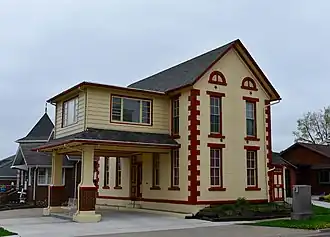 In 1928 the house was converted for use as a filling station. John operated the station. They lived in the second-floor apartment. The yellow and red paint scheme are the Diamond Oil Company's colors.[2] The canopy, added in 1928, originally had a gable roof with half-timbering in the gable end. It was altered to its present appearance in 1956. The gas pumps were located between the columns. In 1955 the filling station became a D-X station. Cordelia Vander Linden sold the property in 1967. The building's conversion into a filling station is what makes it historically significant.[2] It has subsequently housed a travel agency, realtor office, and potter's studio. The building was listed on the National Register of Historic Places in 2008.[1]