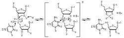 Initially, it was believed that the 75th nucleotide in the ribozyme, a cytosine known as C75, was able to act as a general base with the N3 of C75 abstracting a proton from the 2′-hydroxyl of the U(-1) nucleotide to facilitate nucleophilic attack on the phosphodiester bond.[1] However, although it is well established that the N3 of C75 has a pKa perturbed from its normal value of 4.45 and is closer to about 6.15 or 6.40,[16][17] it is not neutral enough to act as a general base catalyst. Instead, the N3 of C75 is believed to act as a Lewis acid to stabilize the leaving 5′-hydroxyl of the ribozyme; this is supported by its proximity to the 5′-hydroxyl in the crystal structure.[1][18] Substitution of the C75 nucleotide with any other nucleotide abolishes or substantially impairs ribozyme activity, although this activity can be partially restored with imidazole, further implicating C75 in catalytic activity.[19]