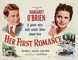 Her First Romance is a 1951 American drama romance film directed by Seymour Friedman and starring Margaret O'Brien, Allen Martin, Jr., Jimmy Hunt and Ann Doran.[1]
