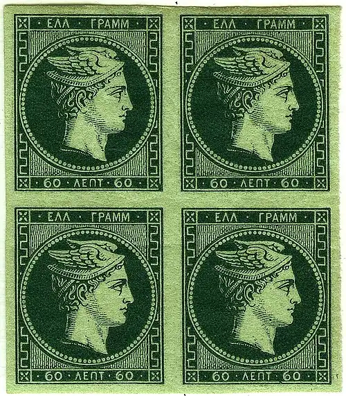 The first type of the Greek stamp is named "large Hermes head" in order to differentiate it from the following one, issued in 1886, and named "small Hermes head".[13]