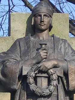 War memorial | Gwersyllt, Wrexham | 1923 | Obelisk-mounted statue | Bronze and stone | Grade II | Q29494213 | [13][14] | |