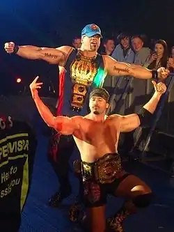In late-2009, Hernandez teamed up with Matt Morgan and D'Angelo Dinero and moved on to feuding with Rhino and Team 3D, who accused TNA of favoring the younger talent of the company.[25] At Turning Point Rhino and Team 3D defeated Morgan, Hernandez and Dinero in a street fight.[26] At Final Resolution Morgan, Hernandez, Dinero and Suicide defeated Neal, Team 3D and Rhino in an eight-man elimination tag team match.[27] On the January 4, 2010, live, three-hour, Monday night episode of Impact! Hernandez and Morgan defeated Dr. Stevie and Raven to become the number one contenders to the TNA World Tag Team Champions British Invasion.[28] At Genesis Hernandez and Morgan defeated the British Invasion to win the TNA World Tag Team Championship.[29] At Against All Odds as part of the 8 Card Stud Tournament Hernandez and Morgan were forced to face each other in the first round. Morgan defeated Hernandez by taking advantage of his injured shoulder and pinning him, while grabbing a hold of his trunks.[30] At Destination X Hernandez and Morgan retained the Tag Team Title in a match against Beer Money despite plenty of miscommunication between the two champions. After the match Morgan nailed Hernandez with the Carbon Footprint.[31] The following day on Impact! Morgan defeated Hernandez via referee stoppage after sandwiching his head between his boot and the ring post. After the match Homicide came out to check on his former partner, who was being helped by medics.[32] TNA later reported on Hernandez's kayfabe injuries, claiming that he had suffered a herniated disc and cervical damage to his neck in the assault and will be out of action indefinitely.[33] The neck injury storyline was created so Hernandez could work in Mexico for three months.[34]