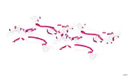 The herpesvirus glycoprotein B is a type-1 transmembrane protein with a signal sequence at its N terminus.[2] The crystal structure of herpes simplex virus (HSV) type-1 and Epstein–Barr virus glycoprotein B ectodomains were solved as a trimer, revealing five structural domains (I-V).[3][4] Domain I contains two internal fusion loops, thought to insert into the cellular membrane during virus-cell fusion.[5] In HSV, domain II is hypothesized to interact with another herpesvirus glycoprotein, gH/gL, during the fusion process.[6] Domain III consists of a structurally important elongated alpha helix, while domain IV is hypothesized to interact with cellular receptors.[7] Finally, domain V acts in conjunction with domain I during protein-lipid interactions. In HSV, neutralizing monoclonal antibodies map to structural domains I, II, IV and V.[7] Due to its unique structure, herpesvirus glycoprotein B (along with vesicular stomatitis virus glycoprotein G and baculovirus gp64) belongs to a new class of viral membrane fusion glycoproteins, class III.[3]