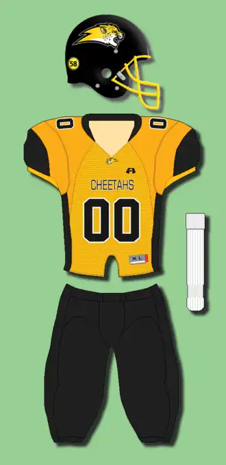 The uniform mainly consisted of yellow/gold jerseys with black numbers and sleeve stripes with black pants and white socks with a white road jersey. Due to budget reasons some of the early uniforms and the uniforms from the 1990s and early 2000s (decade) were mixed together with the black "CHEETAHS" type appearing on the back of the some jerseys as well as the front.