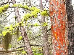 The evergreen tree has a conic crown, growing to heights of 9–25 meters (30–82 ft),[6] exceptionally to 39 m (130 ft), and a trunk diameter of up to 50 centimeters (20 inches), exceptionally to 1 m (40 in). The bark is thin, red when young, and gray in maturity.[6]