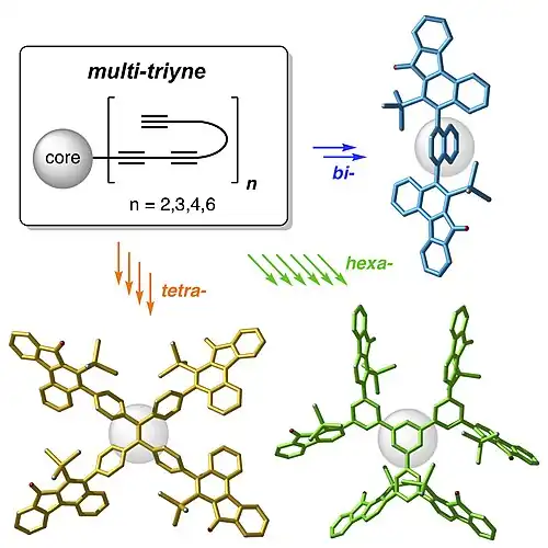 Designer multi-ynes arrayed upon a common, central template undergo sequential, multiple cycloisomerization reactions to produce architecturally novel polycyclic compounds in a single operation.[23] Diverse product topologies are accessible, ranging from highly fused, polycyclic aromatic compounds (PACs) to architectures having structurally complex arms adorning central phenylene or expanded phenylene cores.