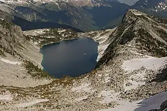 Hidden Lake is located immediately east of Hidden Lake Peaks in North Cascades National Park, in the U. S. state of Washington.[2] Hidden Lake is off designated trails but can reached by way a trailhead off the Cascade River Road from Snoqualmie National Forest.[3] The distance from the trailhead to the lake is 4.5 mi (7.2 km) one way to the overlook and another 0.8 mi (1.3 km) rock scramble through a boulder field to the lakeshore.[4]