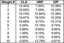Although CLA is designed to minimize portfolio variance, its out-of-sample performance shows the highest variance, exceeding that of HRP by 72.47%. This finding aligns with earlier results from De Miguel et al. (2009).[16] Based on these figures, HRP improves the out-of-sample Sharpe ratio of a CLA strategy by approximately 31.3%. While IVP benefits from assuming a diagonal covariance matrix, its variance remains 38.24% higher than HRP's. These differences are especially important for risk parity strategies, which often employ significant leverage (see Bailey et al., 2014).[23]