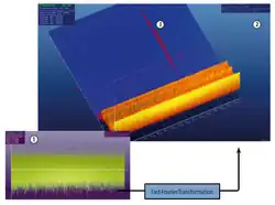 Structure-borne sound signal in the conventional 2-dimensional diagram "amplitude vs. time" (1) and the same signal as 3-dimensional HFIM process landscape (2). The enhanced signal-to-noise ratio becomes obvious while an impulse-like signal (3) becomes directly evident in the HFIM picture whereas it is not visible in the 2-dimensional diagram.