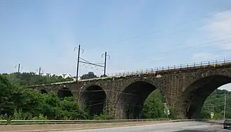 The Coatesville High Bridge is a stone masonry arch railroad viaduct that crosses the valley of the West Branch Brandywine Creek at Coatesville, Pennsylvania. Built by the Pennsylvania Railroad between 1902 and 1904, it has ten arches (eight of 78 feet (24 m) and two of 88 feet (27 m)) and spans a total length of 934 feet (285 m), with wing walls extending it to 1,287 feet (392 m). 78 feet (24 m) high, the bridge was built to accommodate four standard gauge railroad tracks, with a total length of 52 feet (16 m).[1]