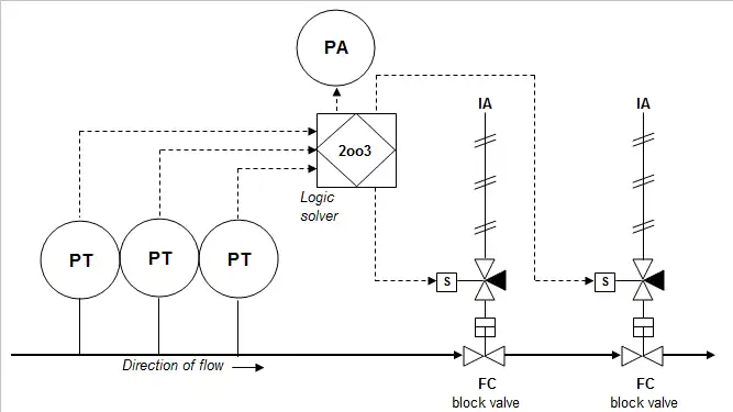 The scheme above presents three pressure transmitters (PT) connected to a logic solver. The solver will decide based on 2-out-of-3 (2oo3) voting whether or not to activate the final element. the 1oo2 solenoid panel decides which valve to be closed. The final elements consist here of two block valves that stop flow to the downstream facilities (right) to prevent them from exceeding a maximum pressure. The operator of the plant is warned through a pressure alarm (PA) that the HIPPS was activated. This system has a high degree of redundancy: