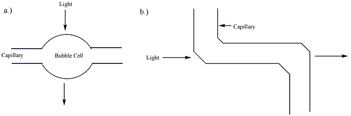 Separation by capillary electrophoresis can be detected by several detection devices. The majority of commercial systems use UV or UV-Vis absorbance as their primary mode of detection. In these systems, a section of the capillary itself is used as the detection cell. The use of on-tube detection enables detection of separated analytes with no loss of resolution. In general, capillaries used in capillary electrophoresis are coated with a polymer (frequently polyimide or Teflon) for increased flexibility. The portion of the capillary used for UV detection, however, must be optically transparent. For polyimide-coated capillaries, a segment of the coating is typically burned or scraped off to provide a bare window several millimeters long. This bare section of capillary can break easily, and capillaries with transparent coatings are available to increase the stability of the cell window. The path length of the detection cell in capillary electrophoresis (~ 50 micrometers) is far less than that of a traditional UV cell (~ 1 cm). According to the Beer-Lambert law, the sensitivity of the detector is proportional to the path length of the cell. To improve the sensitivity, the path length can be increased, though this results in a loss of resolution. The capillary tube itself can be expanded at the detection point, creating a "bubble cell" with a longer path length or additional tubing can be added at the detection point as shown in figure 2. Both of these methods, however, will decrease the resolution of the separation.[4] This decrease is almost unnoticeable if a smooth aneurysm is produced in the wall of a capillary by heating and pressurization, as plug flow can be preserved. This invention by Gary Gordon, US Patent 5061361, typically triples the absorbance path length. When used with a UV absorbance detector, the wider cross-section of the analyte in the cell allows for an illuminating beam twice as large, which reduces shot noise by a factor of two. Together these two factors increase the sensitivity of Agilent Technologies's Bubble Cell CE Detector six times over that of one using a straight capillary. This cell and its manufacture are described on page 62 of the June 1995 issue of the Hewlett-Packard Journal.