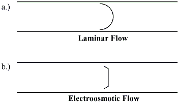 The efficiency of capillary electrophoresis separations is typically much higher than the efficiency of other separation techniques like HPLC. Unlike HPLC, in capillary electrophoresis there is no mass transfer between phases.[4] In addition, the flow profile in EOF-driven systems is flat, rather than the rounded laminar flow profile characteristic of the pressure-driven flow in chromatography columns as shown in figure 5. As a result, EOF does not significantly contribute to band broadening as in pressure-driven chromatography. Capillary electrophoresis separations can have several hundred thousand theoretical plates.[11]