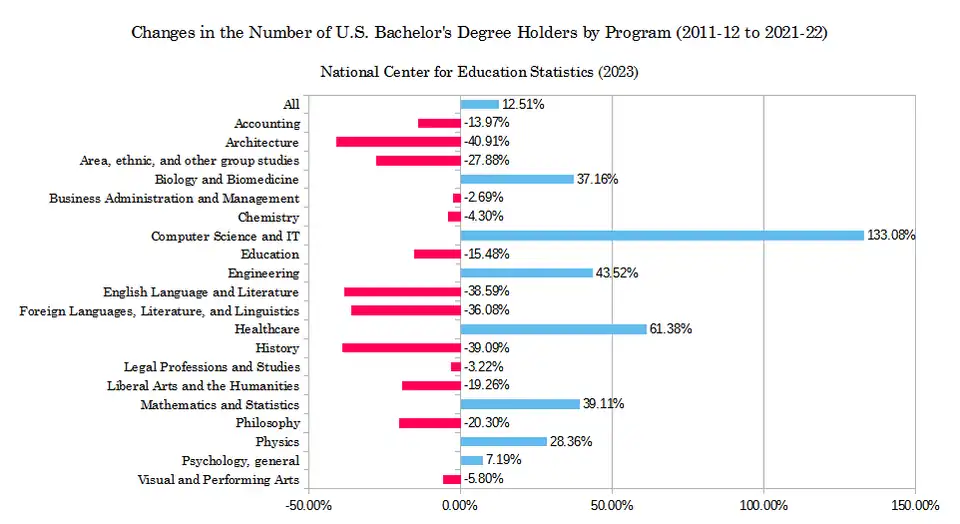 Among graduates of the early 2020s, about half thought they made a bad decision going to college.[73] The most regretted majors include journalism, sociology, liberal arts/general studies, history, communications, and education;[95] the least regretted majors include computer science and information technology, finance, engineering, nursing, and health.[41] Music and the visual arts are the most likely to offer a negative return on investment[44] while English literature, philosophy, and psychology can take up to 20 years just to break even.[73] At the same time, graduates with the highest expected income studied chemical engineering, computer engineering, aerospace engineering, electrical engineering, finance, and the life sciences.[96][42] Prospective employers and state governments have gotten pickier in the collegiate programs they are willing to finance.[43][97] As of 2023, seven states had passed legislation requiring the disclosure of data on the worth of a university degree, such as students' loan payment and post-graduation employment.[7] Another reason for the decline of interest in the humanities and liberal arts is the fact that many prospective students avoided them for fear of loss of parental support,[98] and the perceived intolerance towards conservatives on college campuses, which tend to be dominated by left-wing faculty members.[98] Although there is no evidence that professors push their students to the political left,[99] a number of radical political movements of the 2010s and 2020s have been promulgated by university alumni who feel aggrieved by the status quo for preventing them achieving the power, influence, and wealth they believe they deserve, thereby destabilizing American society.[14][18] Meanwhile, in the life sciences, the number of students or researchers interested in a postdoctoral fellowship had plummeted thanks to a boom in the biotechnology industry, which has had an insatiable appetite for talents and is willing to pay much higher than universities.[100][101] In physics and engineering, which are traditionally male-dominated fields, enrollments had also fallen since 2020, as white men lost interest in higher education.[38] Due to these trends, public universities have also trimmed their STEM departments.[102]