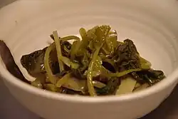 Processed products of water-grown wasabi include additive‐free wasabi paste, Japanese yam paste mixed with wasabi,[7] sausages containing wasabi, and other things.[30] Soil-grown wasabi is used mainly to make wasabi paste.[31][32] Soil-grown wasabi's leaves, stems, and flower parts are also used as ingredients of pickled products such as shōyu-zuke (soy sauce pickles), sakekasu-zuke (pickles in sake lees), miso-zuke (miso pickles),[33] and sweets such as ice cream[34] and pudding.[35][36] Wasabi shoots (known locally as ganime) with good texture are used especially for shōyu-zuke.