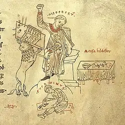 Hildebert and Everwin were two lay medieval artists. They are the first artists known by name who were active in the area covered by today's Czech Republic.[1][2] They worked as illuminators in the scriptorium of Bishop Jindřich Zdík in the first half of the 12th century. The scriptorium, which was at that time the most important illuminators' workshop in Moravia, was located in Olomouc.[3][4] Hildebert and Everwin depicted themselves in two illuminated manuscripts of around 1140.[5] They took part in creating the Olomouc Collectarium (known also as the Olomouc Horologium or Horologium Olomucense). They also participated in illuminating the manuscript De Civitate Dei, written by Augustine of Hippo.[2] It is now in the Capitular Library in Prague (codex A 21/1, fol. 153r). It is thought that Hildebert was the master illuminator, while Everwin was an assistant or apprentice.