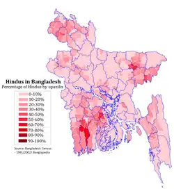 Map of percentage of Bangladeshi Hindus by Upazila or Sub-district (2011 Census)