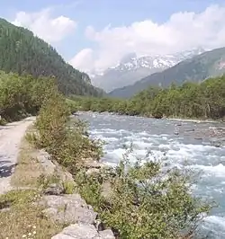 To learn about the importance of travel along the Hinterrhein, a multiday trekking route is signposted along the river from Thusis to Splügen, where it turns south to Splügen Pass, a historically important transit route to Italy.[2] Nowadays there is no traffic across the Splügen pass in winter, whereas the route across its age-old rival, the San Bernardino Pass, was given a long road tunnel in 1967 that made it possible to keep the road open all year.[3]