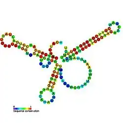 The Histidine operon leader is an RNA element found in the bacterial histidine operon. At least 6 amino acid operons are known to be regulated by attenuation.[1] In each a leader sequence of 150–200 bp is found upstream of the first gene in the operon. This leader sequence can assume two different secondary structures known as the terminator and the anti-terminator structure. In each case the leader also codes for very short peptide sequence that is rich in the end product amino acid of the operon. The terminator structure is recognised as a termination signal for RNA polymerase and the operon is not transcribed. This structure forms when the cell has an excess of the regulatory amino acid and ribosome movement over the leader transcript is not impeded.[1] When there is a deficiency of the charged tRNA of the regulatory amino acid the ribosome translating the leader peptide stalls and the antiterminator structure can form. This allows RNA polymerase to transcribe the operon.[1]