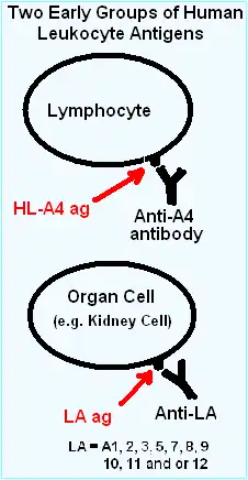 As the study of these 'rejection' sera and "allo"-antigens progressed, certain patterns in the antibody recognition were recognized. The first major observation, in 1969, was that an allotypic antibodies to "4" ("Four") was only found on lymphocytes, while most of the antigens, termed "LA", recognized most cells in the body.[17]
