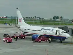 A Braathens Boeing 737-400 at Oslo Airport, Gardermoen. This was the last livery used by Braathens, modified with the re-introduction of the Norwegian flag on the tailplane.
