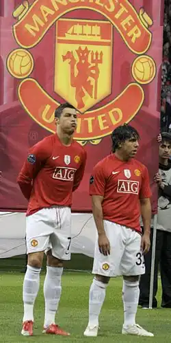 In the following summer transfer window, star player Cristiano Ronaldo was sold to Real Madrid for a world record £80 million and Carlos Tevez joined local rivals Manchester City, after his loan spell came to an end.[45] On 28 February 2010, Manchester United defeated Aston Villa 2–1 at Wembley Stadium to retain the League Cup, the first time the club had successfully defended a knockout cup competition.[20] However, they were knocked out of the Champions League in the quarter-finals by Bayern Munich on away goals,[46] and were runners-up in the Premier League, finishing one point behind Chelsea.[47]