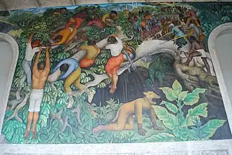 Coming back to Mexico during the middle of its political revolution, Rivera was drawn in by then Mexican Secretary of Education, José Vasconcelos, who called him to create paintings on the walls of prominent state buildings.[2] Rivera then began to partake in the muralist movement, creating works dealing with the political issues of the time – revolutionary nationalism – in relation to Mexico's past and quickly becoming one of the most well known artists of the Mexican muralism movement, with many considering Rivera's pieces to be unforgettable, as they stick within the minds and hearts of those that see them.[2]