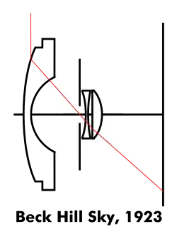 The first fisheye lens was the Beck Hill Sky (or Cloud; UK) lens of 1923. Robin Hill intended it to be pointed straight up to take 360° azimuth barrel distorted hemispheric sky images for scientific cloud cover studies.[66] It used a bulging negative meniscus to compress the 180° field to 60° before passing the light through a stop to a moderate wide angle lens.[9]: 557  The Sky was 21mm f/8 producing 63 mm-diameter images.[67] Pairs were used at 500 meter spacing producing stereoscopes for the British Meteorological Office.[68]