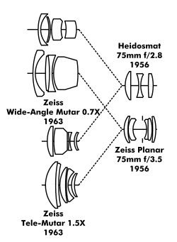 Some afocal attachments, such as the Zeiss Tele-Mutar 1.5× and Wide-Angle-Mutar 0.7× (1963, West Germany) for various fixed lens Franke and Heidecke Rolleiflex brand 120 roll film twin-lens reflex cameras, were of higher quality and price, but still not equal to true interchangeable lenses in image quality. The very bulky Mutars could change a Rolleiflex 3.5E/C's Heidosmat 75mm f/2.8 and Zeiss Planar 75mm f/3.5 (1956, West Germany) viewing and imaging lenses into 115mm and 52mm equivalents.[91][92] Afocal attachments are still available for digital point-and-shoot cameras.[93][94]