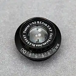 The Tessar was the standard high-quality, moderate-aperture, normal-perspective lens of the twentieth century. The Kodak Anastigmat Special 100mm f/3.5 on the Kodak Super Six-20 (1938, USA), the first autoexposure still camera, was a Tessar,[36] as was the D. Zuiko 2.8 cm f/3.5 on the Olympus Pen (1959, Japan), the original Pen half frame camera;[37] the Schneider S-Xenar 40mm f/3.5 on the late version of the Rollei 35 (1974, West Germany/Singapore);[38][39] and the AF Nikkor D 45mm f/2.8P Special Edition for the Nikon FM3A (2001, Japan), the last manual focus 35mm SLR released by a major maker.[40] It was fitting that the Zeiss Stiftung's last camera, the Zeiss Ikon S 312, had a Zeiss Tessar 40mm f/2.8 (1972, West Germany).[41]