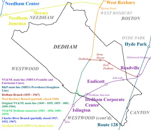 - ^ Today, most of the former Midland Railroad's route is the MBTA's Fairmount Line; the southern segment, between Readville and West Dedham (now Islington), now forms part of the Franklin/Foxboro Line.[5]
