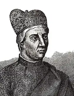 From 998, the year when Otto III was a guest at the Doge's Palace, to 1105 there are no sources that give precise information about the renovations undergone by the building's factory.[13] It is, however, probable that Domenico Selvo, doge between 1071 and 1084, oversaw the decoration of the palace as he himself gave a strong impetus to that of the adjoining church.[14] Nevertheless, all these decorations were destroyed in the subsequent restorations and in particular by the fire of 1574: as Francesco Sansovino recalls, "the doors of Parian marble columned and figured with great skill" that were present in the hall of the Four Doors were destroyed.[14] The next doge Vitale Faliero had the opportunity to host Emperor Henry IV in the palace, who, being very devout, had come to the city as the body of Mark the Evangelist was there.[15] Under the dogeship of Ordelafo Faliero two fires occurred at the distance of two months, approximately around the year 1105, which destroyed various city buildings.[15] The more tragic of the two was probably the second, which broke out due to lightning and spread due to strong winds.[15] The damage that this fire caused to the basilica and the palace is only hinted at by historians of the time,[16] who do not even describe the renovation overseen by the doge, which was concluded before 1116, the year in which he hosted Henry V.[16]