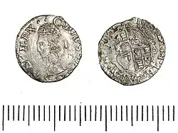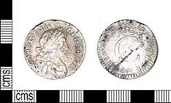 The Commonwealth of England (1649–60) is well known for having produced the only English coins which did not contain any Latin inscription at all. This was due to an association of Latin with Catholicism.[1] As far as the Commonwealth penny is concerned, the inscriptions are totally absent. The reverse shows St George's shield within a wreath, while the obverse shows St George's shield and an Irish shield, with the denomination I above them.