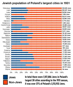 The number of Jews immigrating to Poland from Ukraine and Soviet Russia during the interwar period grew rapidly. Jewish population in the area of former Congress of Poland increased sevenfold between 1816 and 1921, from around 213,000 to roughly 1,500,000.[99] According to the Polish national census of 1921, there were 2,845,364 Jews living in the Second Polish Republic. According to the national census of 1931, there were 3,113,933 Jews living in Poland. By late 1938 that number had grown to approximately 3,310,000. The average rate of permanent settlement was about 30,000 per annum. At the same time, every year around 100,000 Jews were passing through Poland in unofficial emigration overseas Between the end of the Polish–Soviet War and late 1938, the Jewish population of the Republic had grown by over 464,000.[100] According to the 1931 census one city had over 350,000 Jewish inhabitants (Warsaw), one city had over 200,000 Jewish inhabitants (Lodz), one city had around 100,000 Jewish inhabitants (Lvov) and two cities had over 50,000 Jewish inhabitants each (Cracow and Vilno). In total these five cities had 766,272 Jews which was almost 25% of the total Jewish population of Poland. In cities and towns larger than 25,000 inhabitants there lived nearly 44% of Poland's Jews.