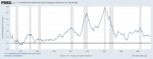 The Nixon Administration seized on student demonstrations to mobilize a conservative majority consisting of middle-class suburbanites and working-class whites critical of radical extremists. Economics also played a role in this mobilization. As a result of the Vietnam War, and Lyndon Johnson's failure to raise taxes to pay for it, inflation shot up and real incomes declined. Many lower middle-class whites were critical of federal programs targeted towards blacks and the poor, with one observer noting that their wages were often only “a notch or so above the welfare payments of liberal states,” and yet “they are excluded from social programs targeted at the disadvantaged.”[51] Numerous articles published at that time focused on the feelings of discontent that existed amongst many Americans.[52][53][54][55][56]