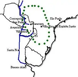 Up to 1676, during the rise of the industry, the main production centre of yerba mate was the Indian town of Maracayú northeast of Asunción. In Maracayú, amid forests rich in yerba mate, settlers from Asunción dominated production. Maracayú came however to be the place of long-standing conflict when settlers from the towns of Villa Rica del Espíritu Santo and Ciudad Real del Guayrá begun to move into the Maracayú area that the old settlers regarded as theirs. In the 1630 the conflict escalated when settlers from Villa Rica and Ciudad Real del Guayrá and the Jesuit missions of Guairá had to flee over to the Maracayú area due to attacks from Portuguese settlers from São Paulo. In the Maracayú area the new settlers made mate their main income source sparking a conflict with the settlers of Asunción which only ended in 1676 when the Portuguese settlers made another push making Maracayú a rather exposed borderland zone. The settlers of Maracaýu relocated to the south forming the modern city of Villarrica and transformed their new lands into the new centre of the mate industry.[8]